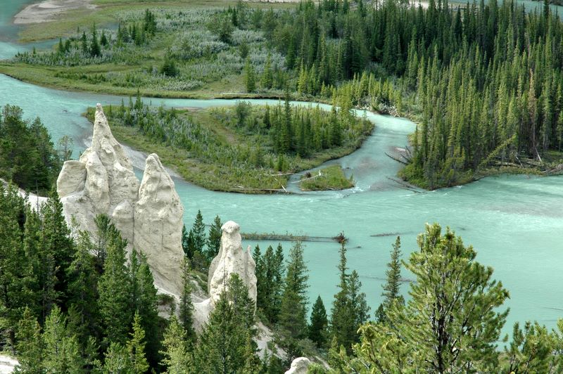 We started our day early, as was appropriate when we were used to getting up an hour or two earlier. Not many people were out when we started walking around downtown Banff about 7AM, but we did find good coffee and rolls at a local place, Evelyn's Coffee Shop. Our first sightseeing (other than Banff itself) was a drive up Tunnel Mountain. Our first stop was at the Hoodoos interpretive trail, over the Bow River, where we both walked the short trail and looked at the views. There are only a few hoodoos here, unlike the hundreds or thousands at Bryce Canyon, but they are suitably named - the same sort of weird stone outcroppings.