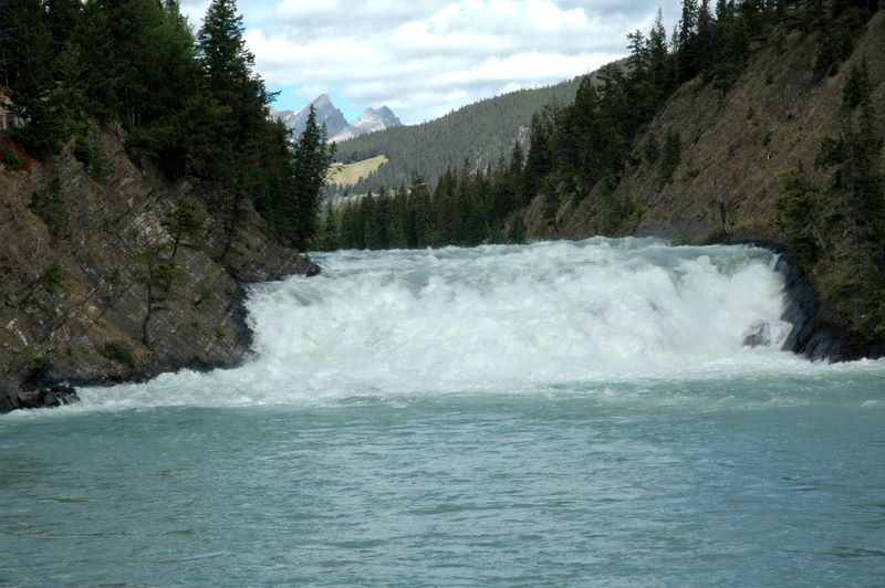 Continuing on our morning’s driving tour, we crossed the Bow River and drove up Sulphur Mountain past the hot springs to the gondola. That turned out to be as close as we got to any of the activities there. We then passed the Banff Springs Hotel and took the scenic drive through the Bow Springs Golf Course. Part of the route goes well past the golf course itself and becomes very peaceful and scenic along the river(s) (the Spray River and the Bow River converge just above Bow Falls). The route back took us past the parking lot for Bow Falls, so we stopped there and I walked a little upstream to get a better view (stopping before I had to go DOWN again).