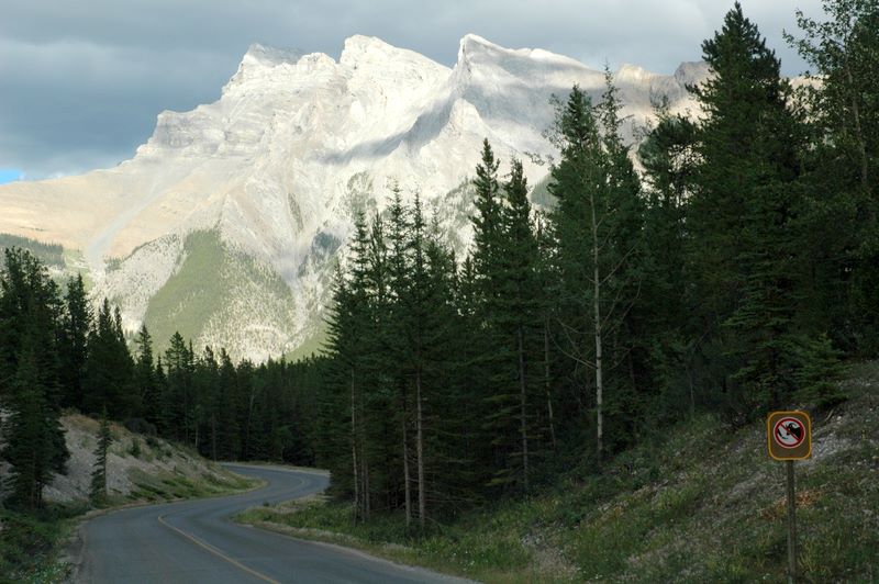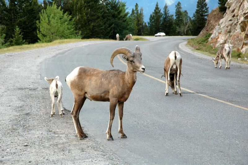 We spent the rest of the afternoon driving through the eastern part of Jasper, along Rt. 16. We took the Miette Hot Springs side road, but didn’t actually get closer to the springs than the parking lot (you could smell the sulfur from there). It was way too hot for hot springs to be appealing. Punchbowl Falls is also along the Miette Hot Springs road, but the guidebook author who called it “photogenic” has different ideas than I do. En route back, we stopped where a flock of bighorn sheep had been since we were headed east, and watched them until the leader decided it was time for them to cross the highway. It was clear why they have frequent warning signs about wildlife on the road!