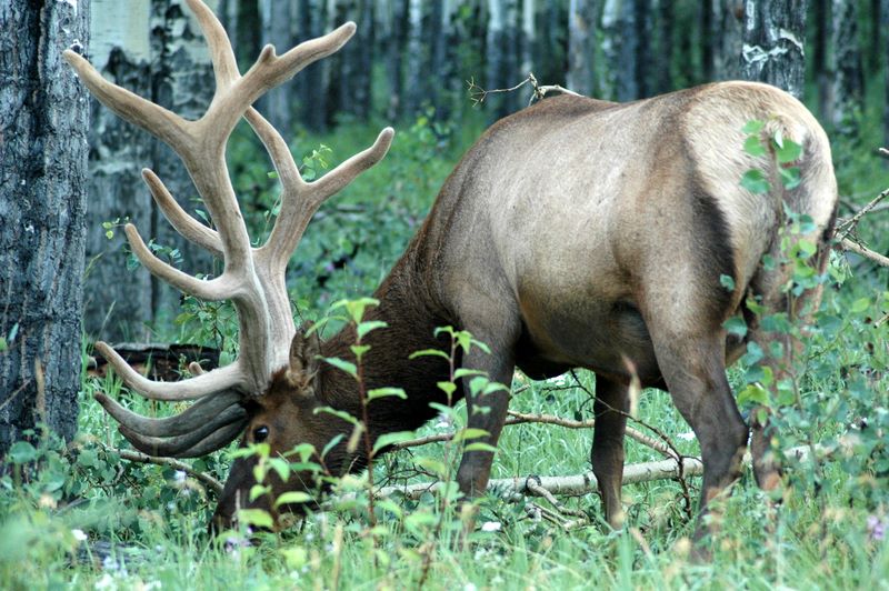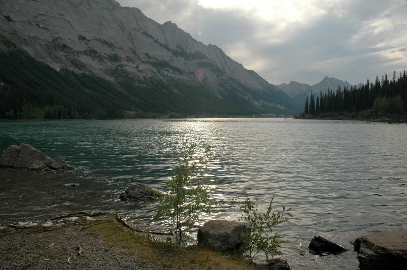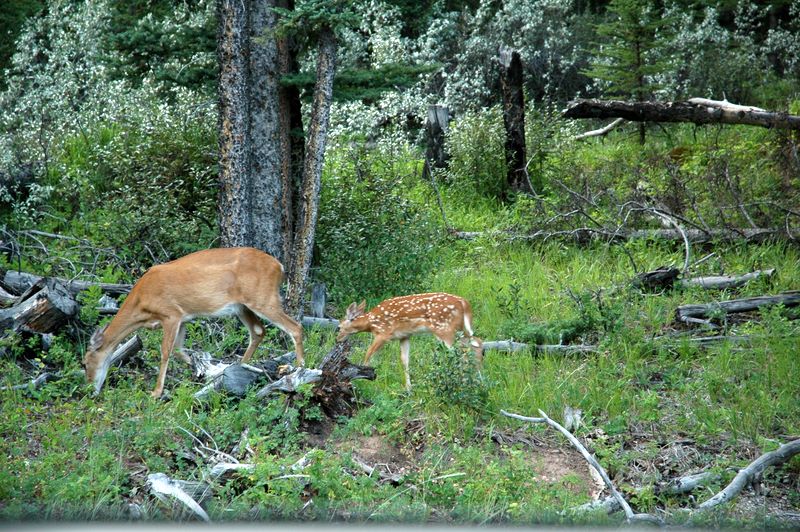 Getting back to Mom after a couple of hours or so, we relaxed for a while, then went in search of an early dinner. The most promising restaurant from my perspective had too long a wait at 6PM and told us to try earlier (!!) so we wound up with pizza slices at the food court at the (very small) Cascade Mall. That left us plenty of time after dinner to drive out to the scenic Minnewanka Loop, where there are several pretty lakes, nice mountain views, and wildlife. We were within a few feet of bighorn sheep (who were busy licking minerals from the ground and didn’t care about us), plus we saw elk, ground squirrels, and a doe with two fawns. We were probably lucky we didn’t see the grizzly which had a bad “interaction” with some humans that same day (they accidentally got between the mother and cubs).
