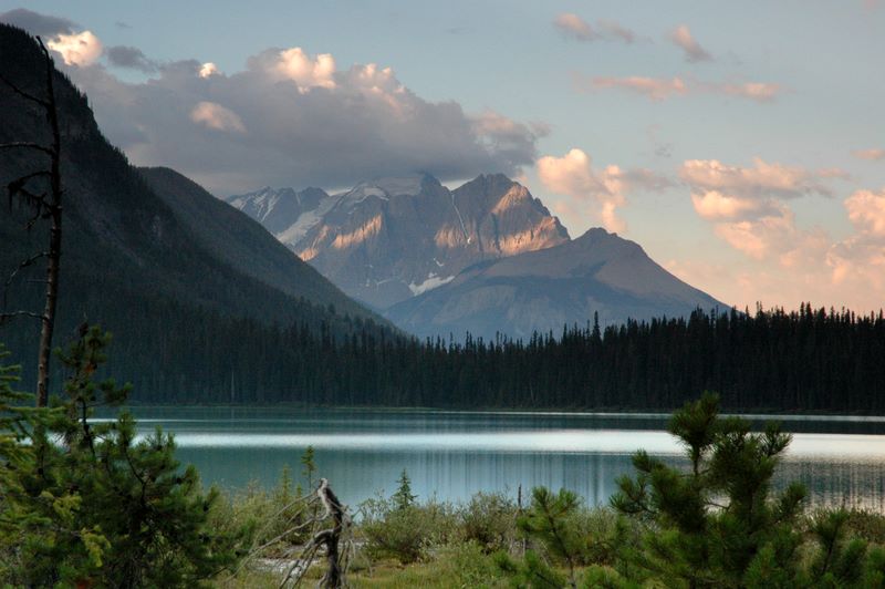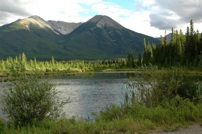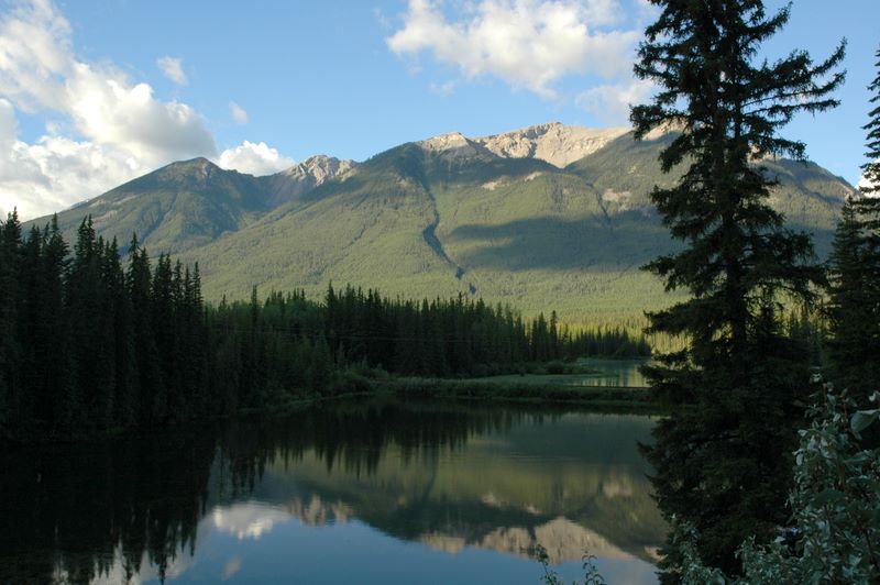 We still had daylight and (some) energy, so we drove over to the Vermilion Lakes. The three lakes are very pretty, and a nice place for bicyclists. I made one bad choice: we stopped at the Fenland Trail on our way back, about an hour before sunset. Really bad to walk out into a wetland near dusk, especially in a climate where the mosquitoes have a short season to work in! We quickly abandoned the trail and headed back to the car, repellent or no.