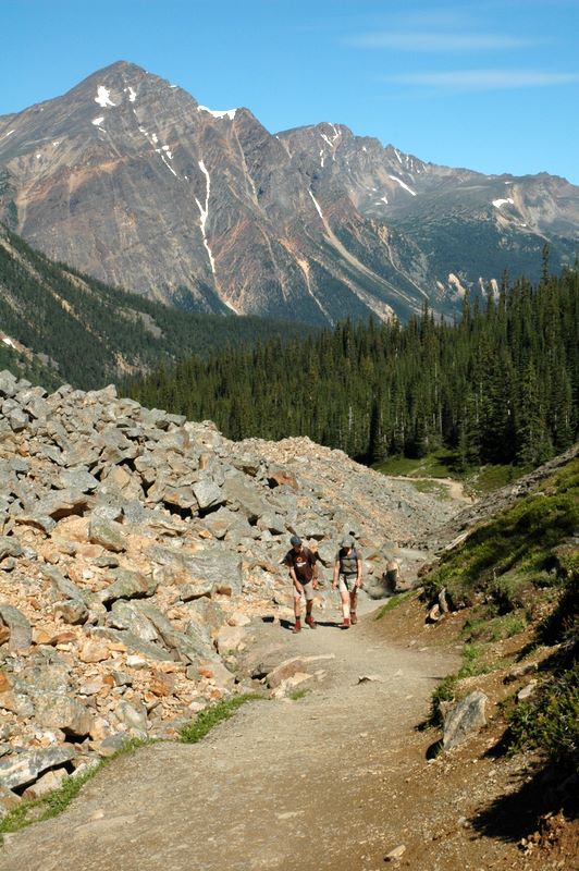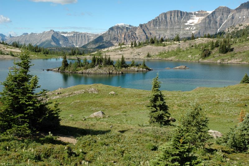 After making the loop around the lakes, we decided there wasn’t enough time for us to make the climb to the Standish Viewpoint (another kilometer and a pretty good climb) without rushing too much to get back by 2PM, which we all needed to do. Having just had a discussion about being “goal oriented” versus “enjoying the journey,” it seemed appropriate that we didn’t overdo it in order to pack in one more destinationConsidering we were hiking at ~7200 feet on my second day in the mountains, it would’ve been difficult for me anyway. We did take a side trip on the trail toward Mt. Assiniboine on the way back, into an area of huge meadows - quite different from the other environments we’d been in. Total distance was 5-6 miles.