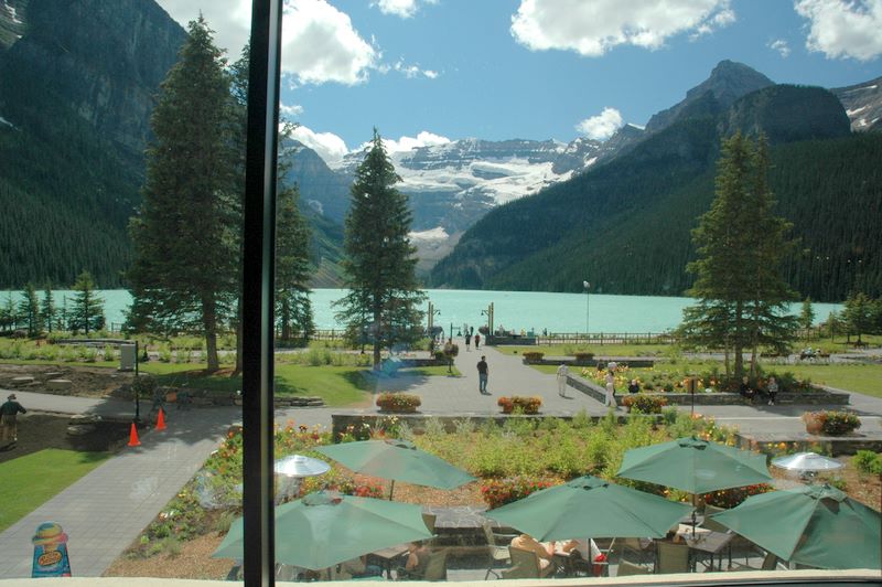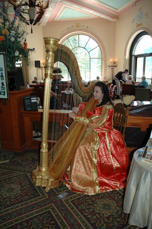 Before too much longer, we arrived at Lake Louise. As we took the road from the village of Lake Louise to the actual lake, the traffic made me realize that we’d better see if we could walk from our hotel! Fortunately, Deer Lodge is the closest hotel to the lake after Chateau Lake Louise, for a fraction of the price…and our room was even ready when we got there (which was a BIG help). The fact that our room wasn’t much bigger than absolutely necessary for the furnishings didn’t much matter. We walked the short distance to the Chateau well before our 3:00 reservation for tea in the Lakeview room (the other event we had pre-scheduled for the week, after Sunshine Meadows). I was glad that I’d mentioned I was a vegetarian when I made the reservation, as it DID matter. Our menu consisted of sparkling wine, finely cut fruit salad with a liqueur topping (I think), finger sandwiches - cucumber, egg salad, salmon, chicken curry wrap (I had two each of the vegetarian ones), scones with Devonshire clotted cream and jam, and mini pastries: lemon meringue pie, eclairs, chocolate bombe, mocha fudgy square. And, of course, our choice of teas! We each got a small box of Chateau Lake Louise’s own tea blend as a souvenir of our (expensive) afternoon’s treat. My photos include our view from our window seat and a picture of the harpist who was playing while we ate.