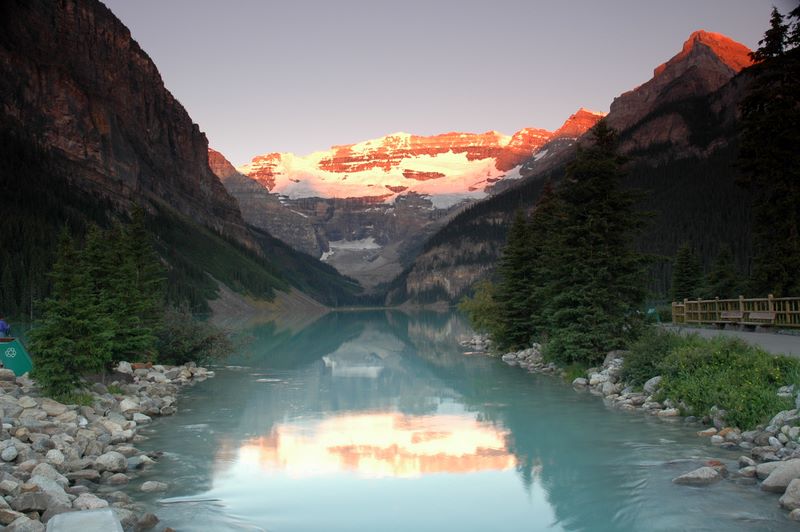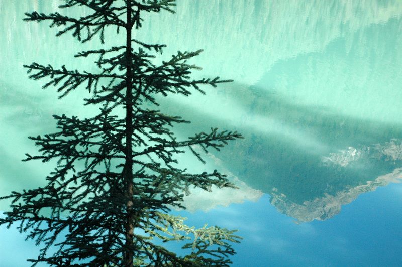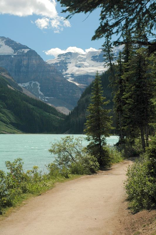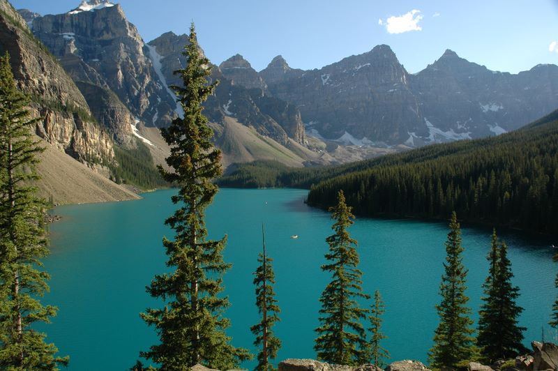 After tea, we walked around the garden between Chateau Lake Louise and the lake for a little while, then Mom went back to the hotel and I walked partway down the Lake Louise lakeshore trail. While I was walking, Mom ran into Malvika, the woman I had hiked with the day before, and her mother! When I got back, we headed off to Moraine Lake, a wilder and some say more beautiful neighbor of Lake Louise. Both are fed by glaciers. I took the lakeshore trail at Moraine Lake to the far end. While walking, I ran into Malvika, and stopped to visit with a couple from New Zealand (the husband noticed I had a similar Nikon - a good conversation starter). I got back to find Mom had just gone out to look for the car after walking partway down the lakeshore herself. Before we left, I climbed up to the viewpoint for the famous “ten peaks” (formerly on Canadian currency) by the huge rockpile at the foot of the lake.