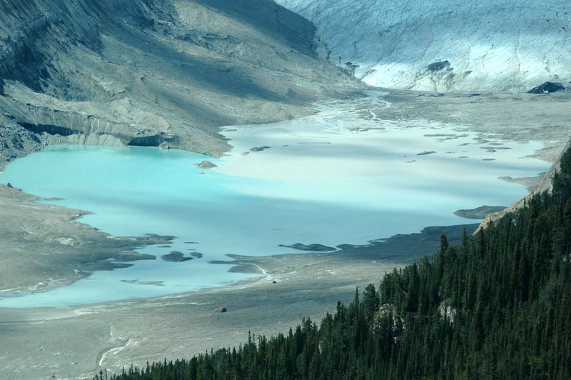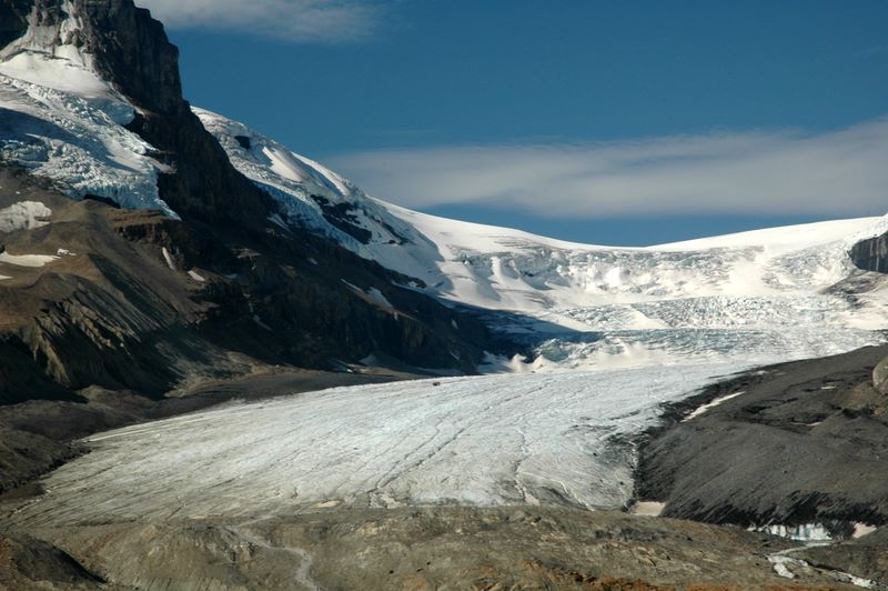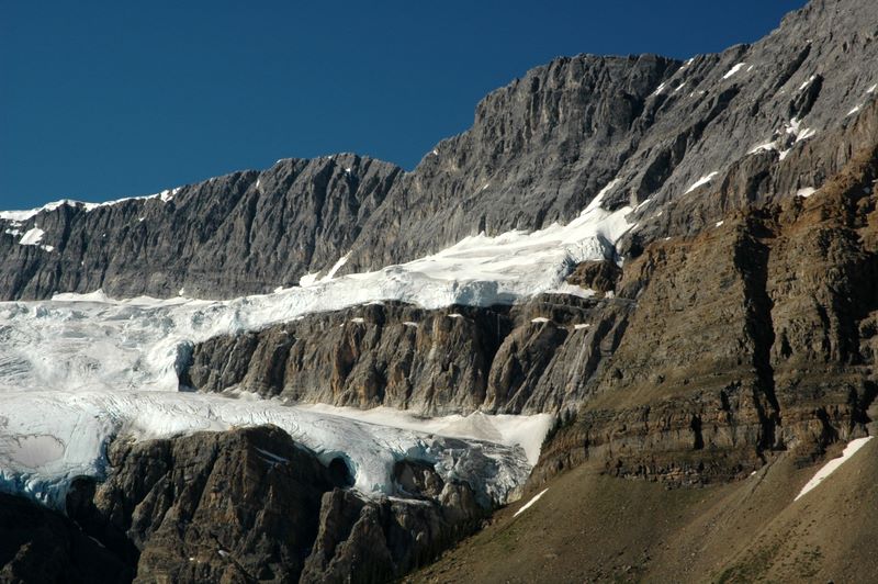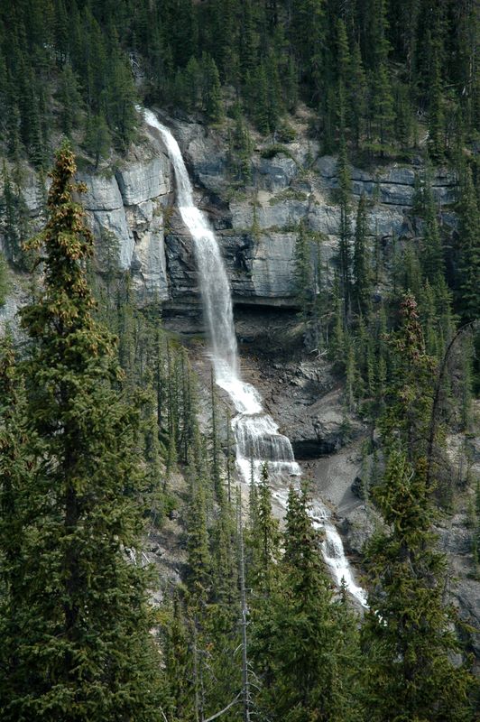 We decided that breakfast at Smitty's would work again before setting out on the Icefields Parkway for our return trip. We stopped at various overlooks we'd skipped before, including a great high panoramic view just north of the Icefield Centre, and Bridal Veil Falls (back in Banff National Park). The light was nice for different pictures this time, which worked for me. We also stopped at the Icefield Centre again, just to stretch our legs. The view of the glacier we had visited was still very impressive.
