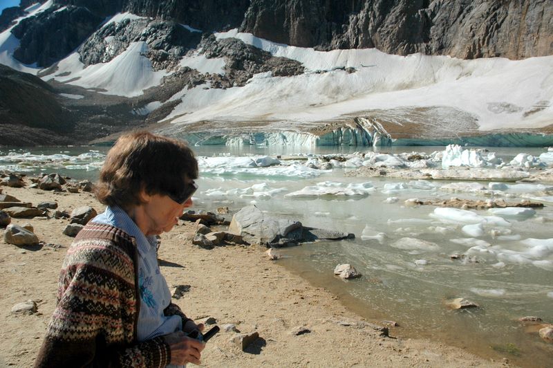 We started our day by waiting for the Soft Rock Cafe to open (apparently most people aren’t out before 7:30AM). Their cinnamon rolls were the draw - they were certainly big! We then headed to Mt. Edith Cavell. I had two hikes in mind: one, the Path of the Moraine Trail, was just one mile and sounded fine for both Mom and me. As often seems to be the case, there was a bit more to that one mile than the description suggested! It was well worth the effort, including the initial climb up a glacial moraine (though Mom might have opted for NOT doing the loop and just walking up the bottom of the valley, if she had known). Standing on the shore of a lake full of chunks of ice was very interesting.