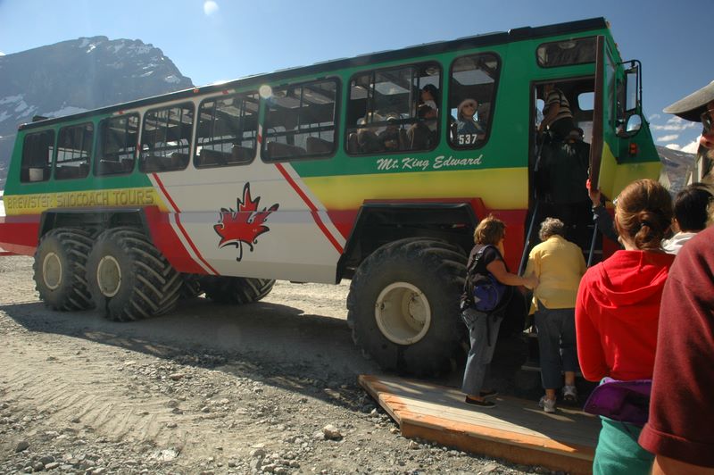 When I got back, Mom was all rested up and ready for the next adventure. We went back down the Icefields Parkway to the Icefield Centre and took the Ice Explorer tour about 5PM, after the tour buses had gone. It was very interesting to get out on a glacier and see how big it really is. It was hard to believe that we were standing on ice 1000 feet thick! There are some 23 Ice Explorer vehicles, 22 of which are operated by the Brewster tour company (which seems to operate most everything in the Canadian Rockies) and one which is U.S. hands in Antarctica. Even the start of the ride was interesting, as the Ice Explorers go down a 36% grade to get to the glacier!